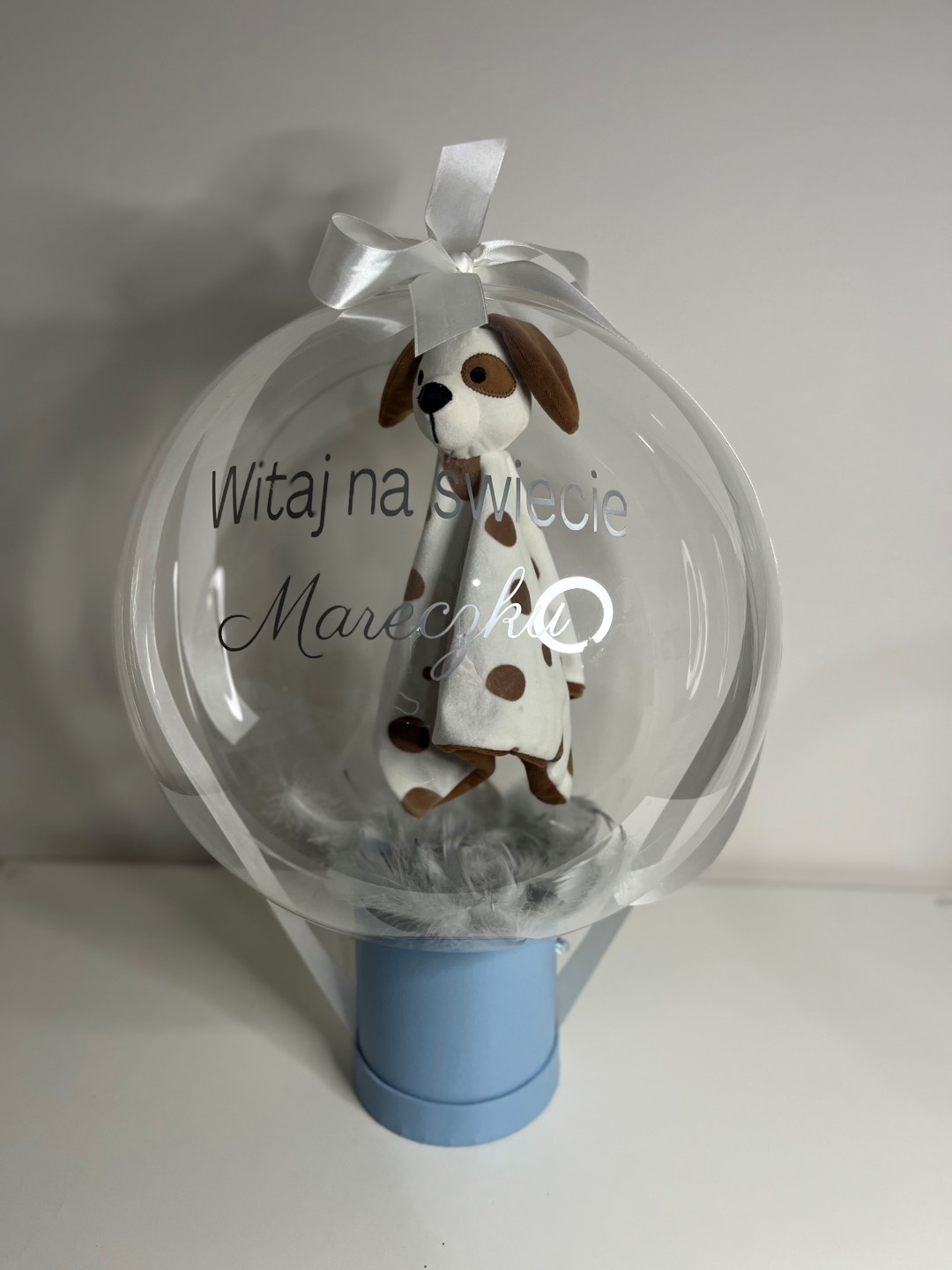Balon z własną dedykacją z maskotką w środku to  nietuzinkowy upominek z okazji przywitania maluszka na świecie.