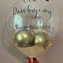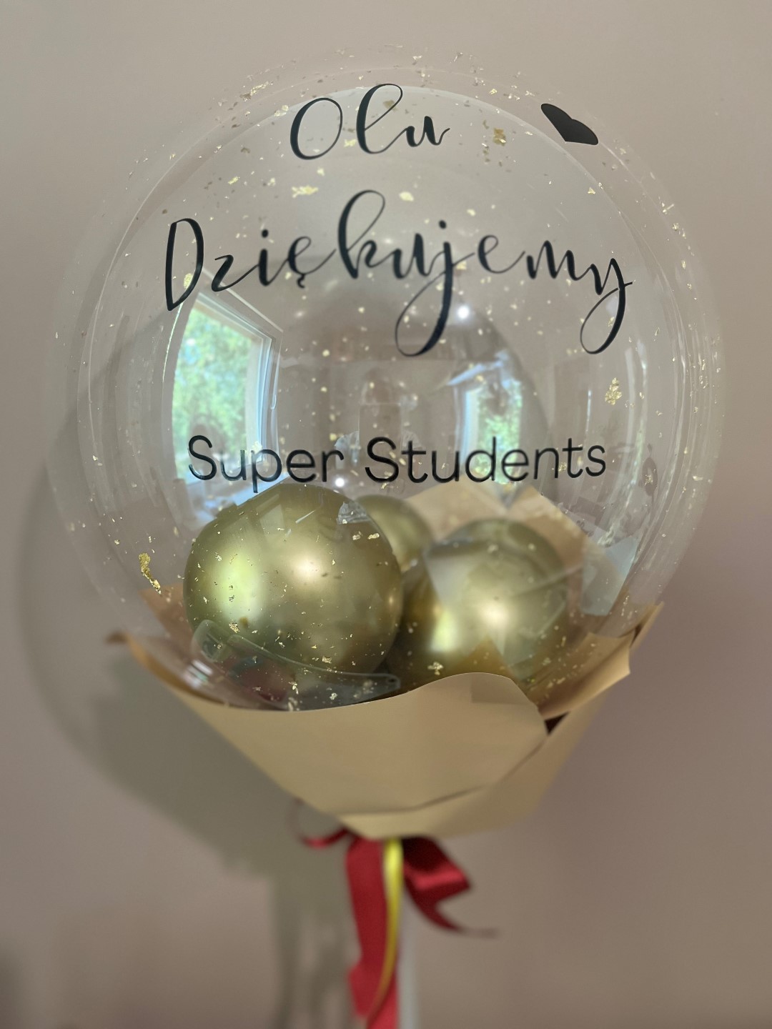 Balon z własną dedykacją wypełniony złotymi balonikami oraz drobinkami złota.