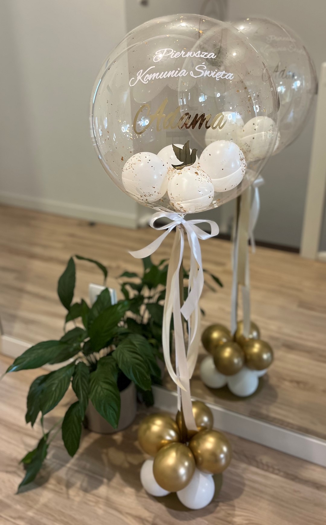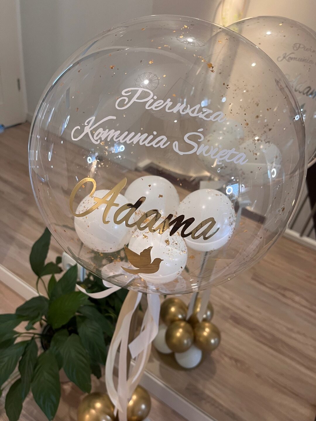 Personalizowany balon na złotym stojaku. Dekoracja na stół. Komunia Święta.