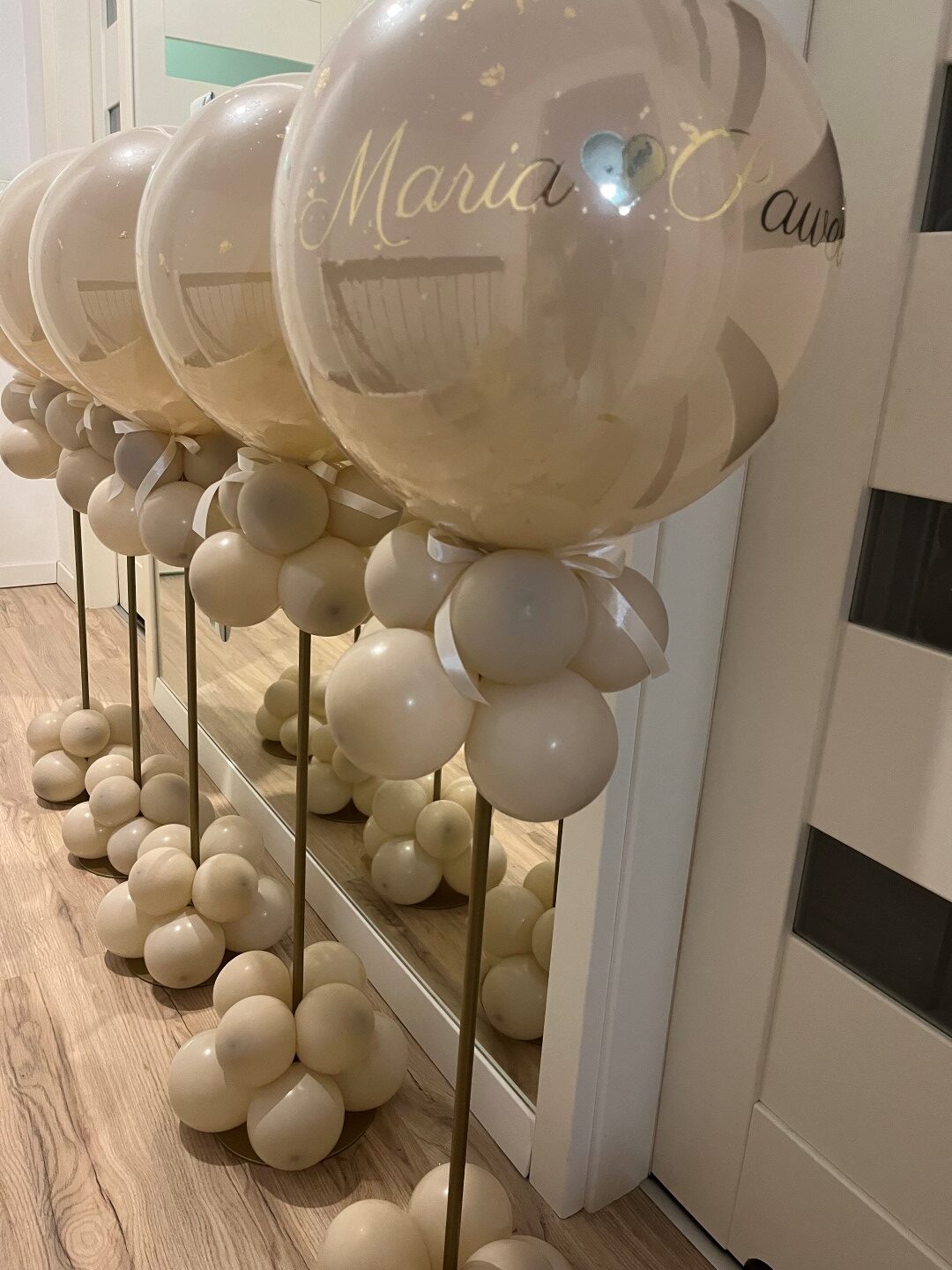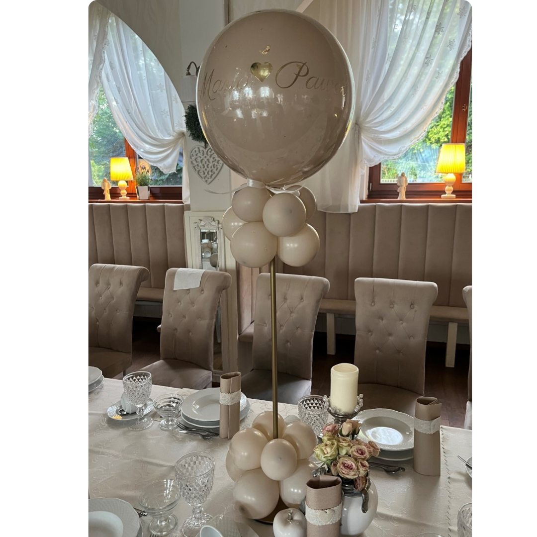 Balony na złotym metalowym stojaku to idealna ozdoba stołu.