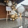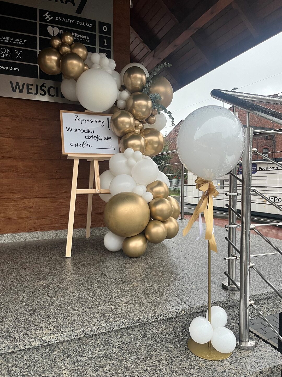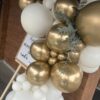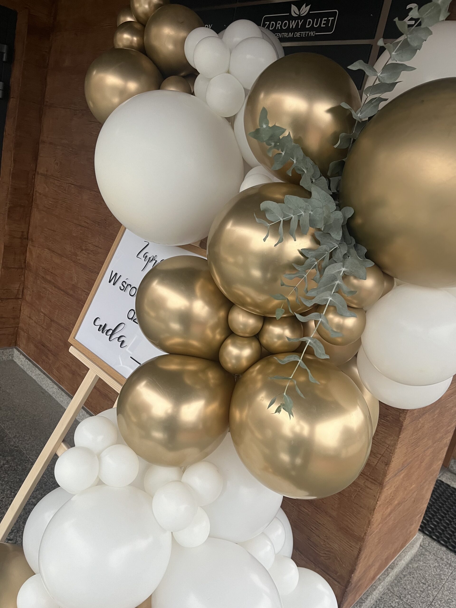 Biało złota girlanda organiczna na drewnianej sztaludze