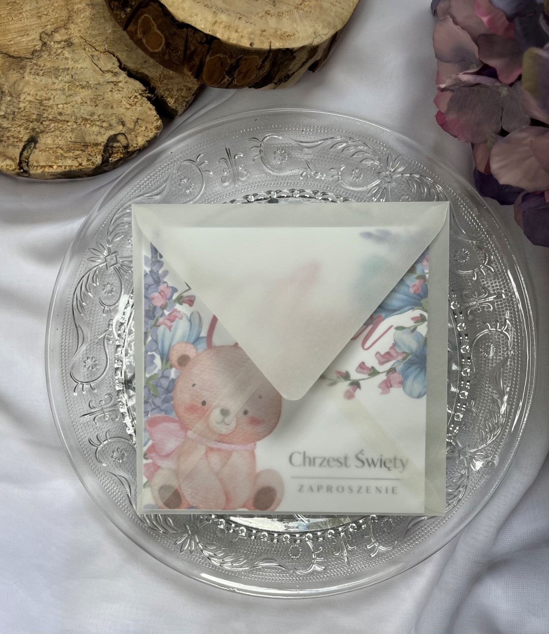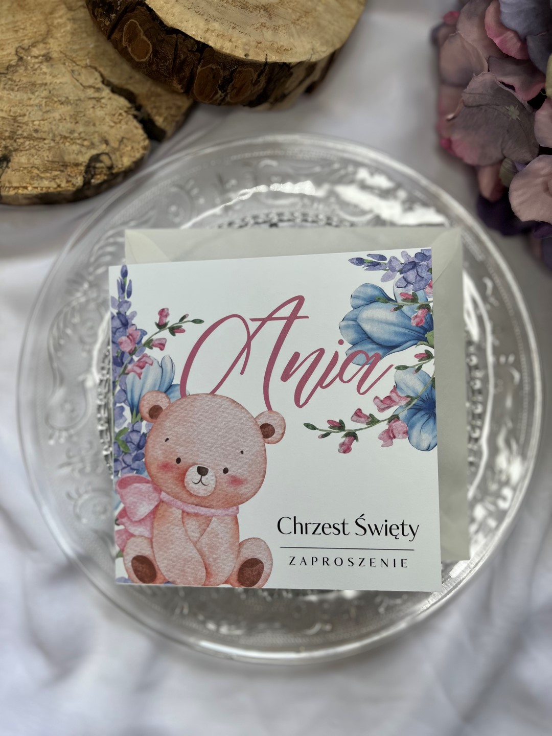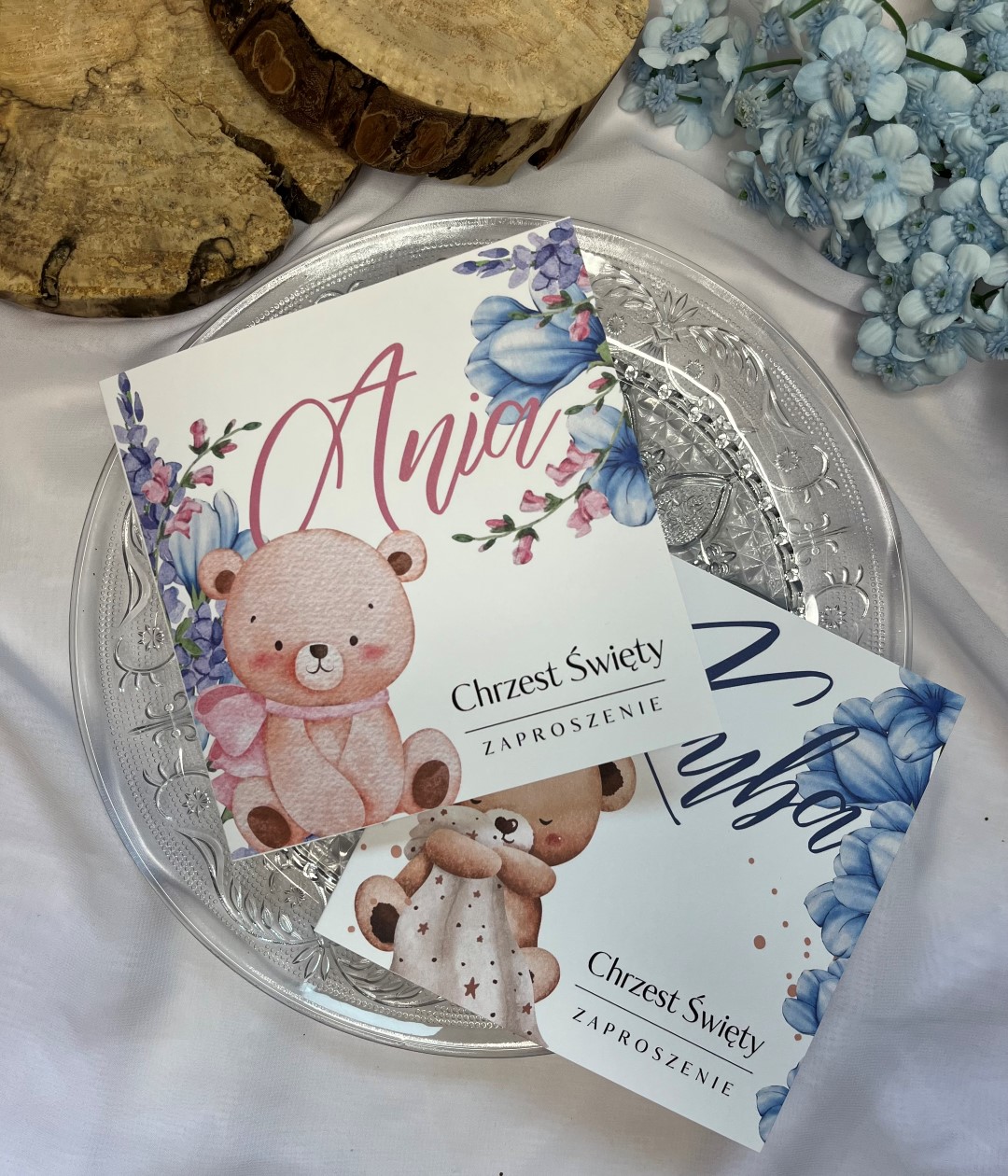 Eleganckie i delikatne zaproszenie na chrzest święty z motywem uroczego misia.