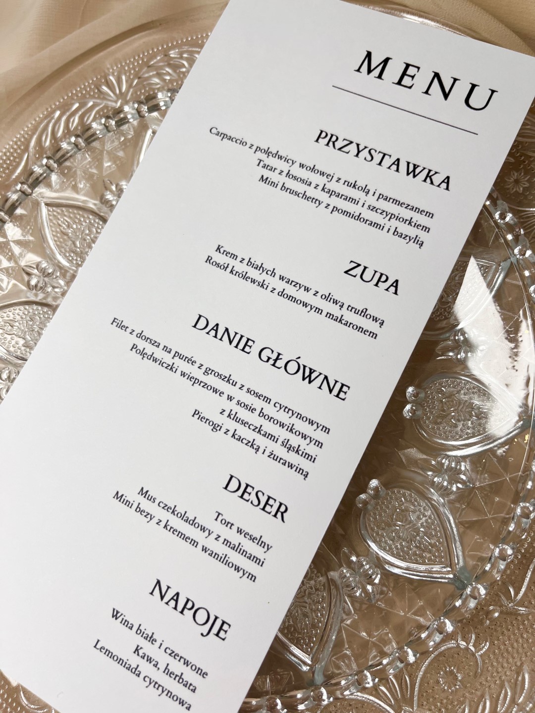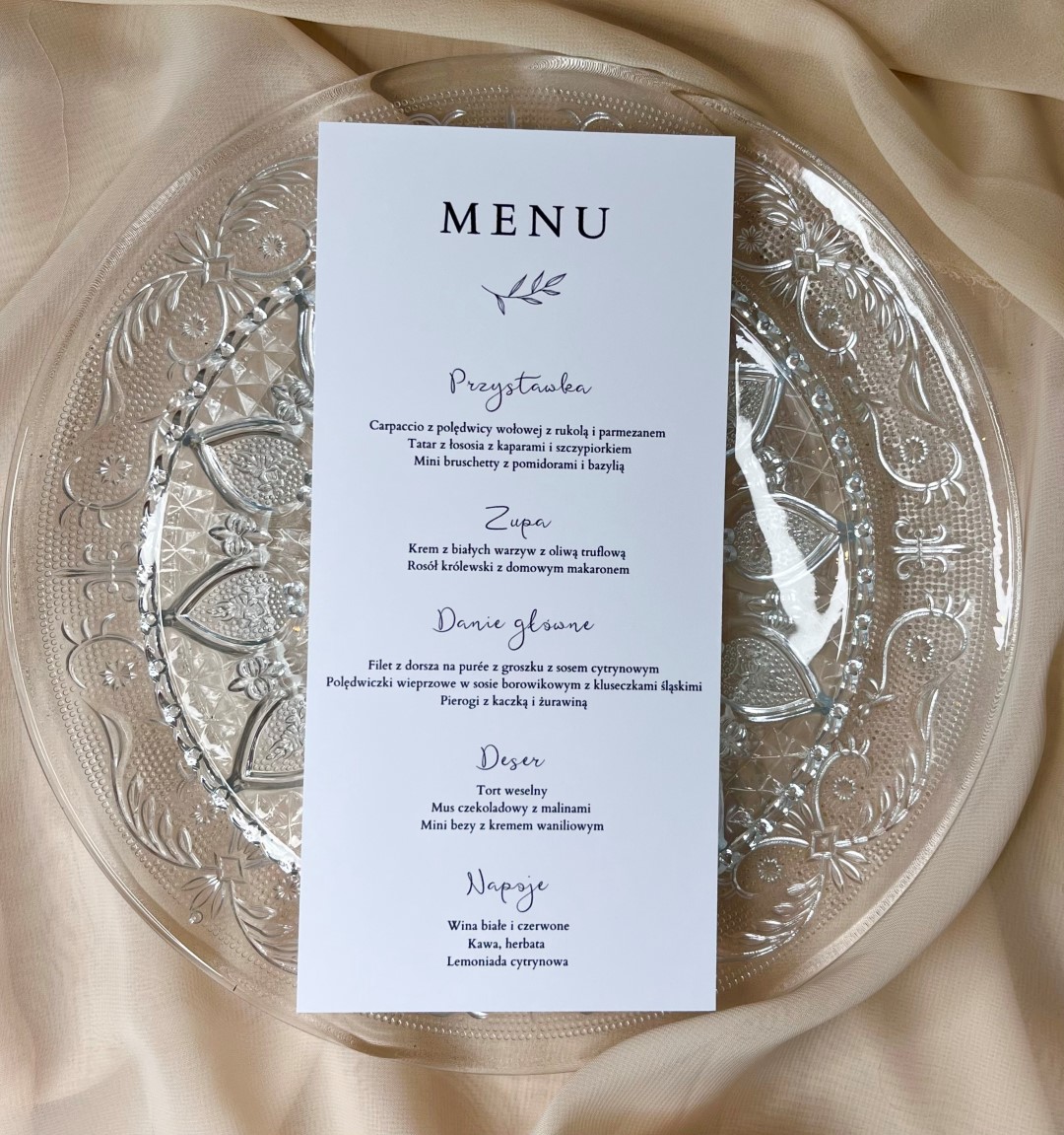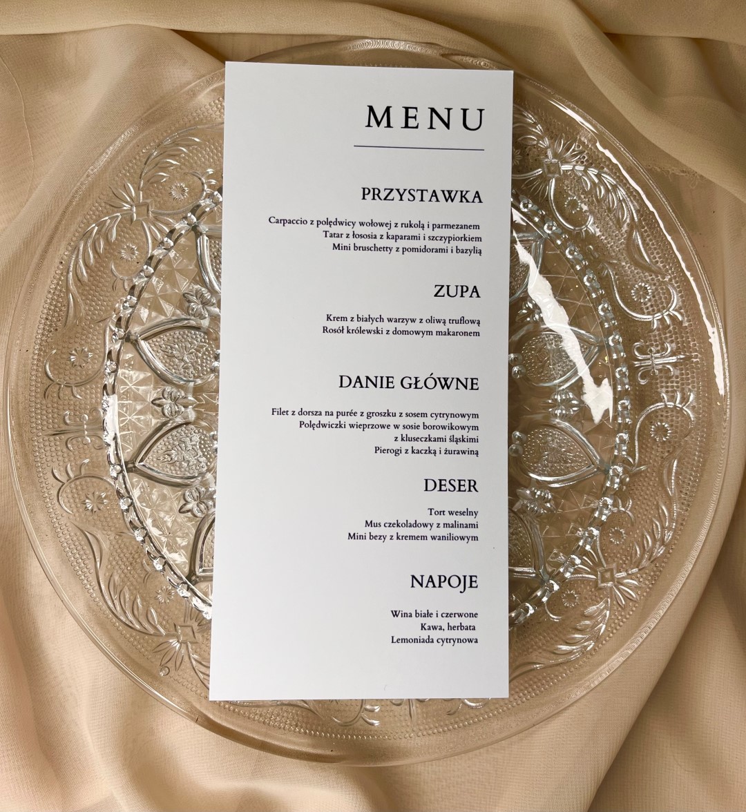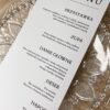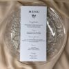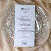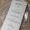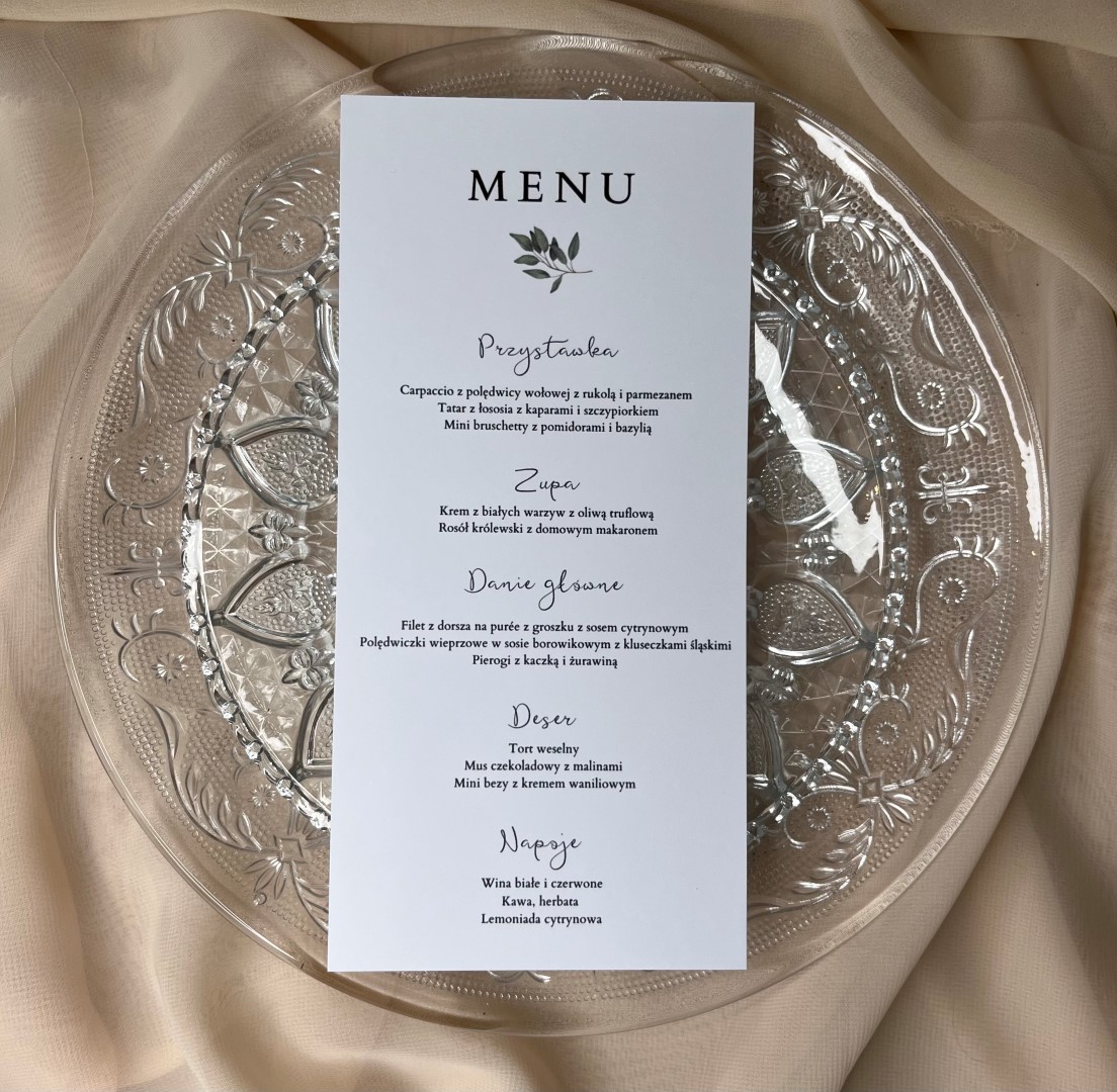 Eleganckie menu weselne wykonane z wysokiej jakości papieru, które pięknie dopełni aranżację stołu. Stylowy projekt i czytelny układ sprawiają, że Goście z łatwością zapoznają się z ofertą dań, a całość stanowi subtelną i gustowną dekorację.