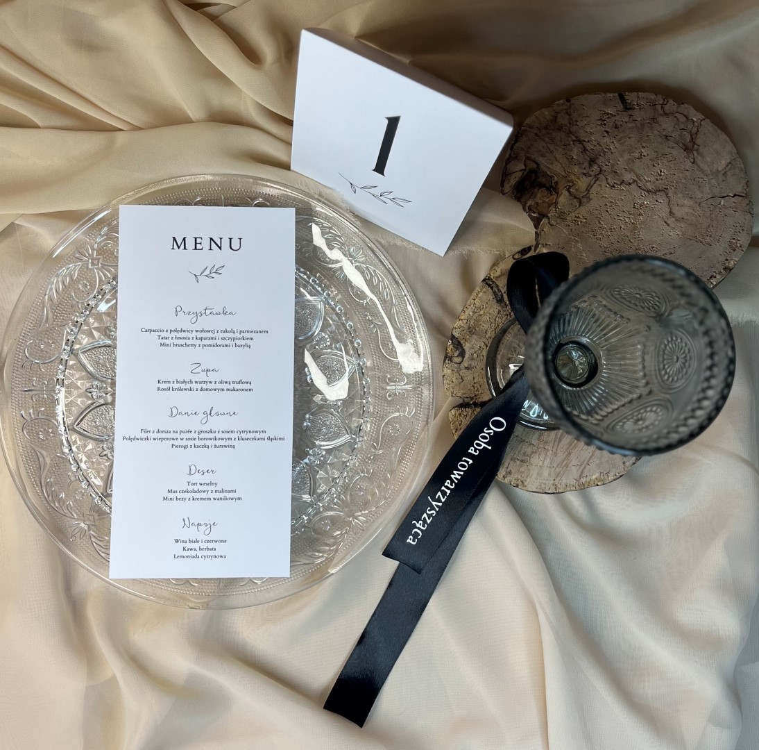 Wymiary: menu – 10×21 cm, nr stołu 10×15 cm (złożony)