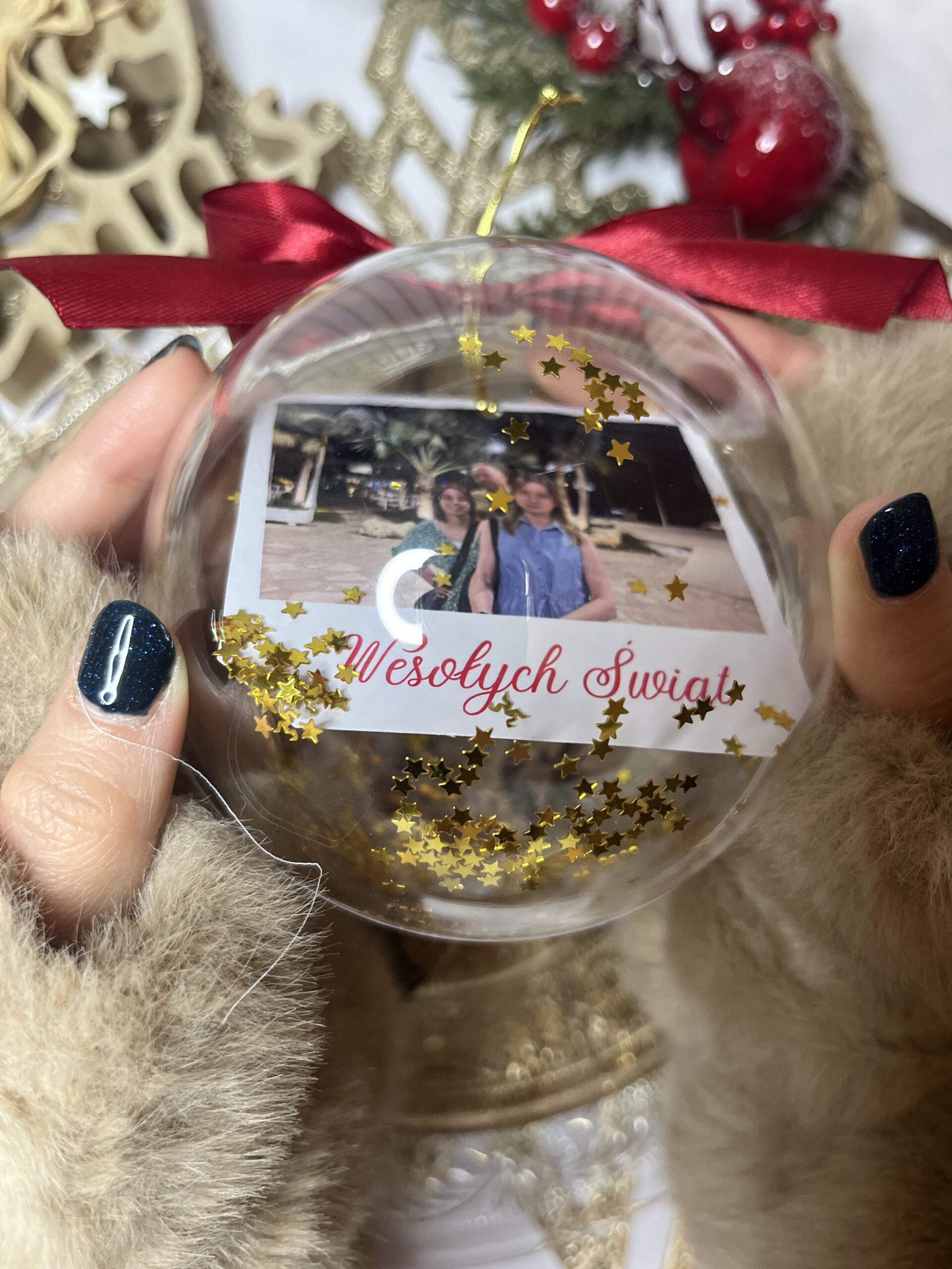 Personalizowana akrylowa bombka z Twoim zdjęciem i złotym konfetti ze złotych gwiazdeczek to wyjątkowy świąteczny upominek.