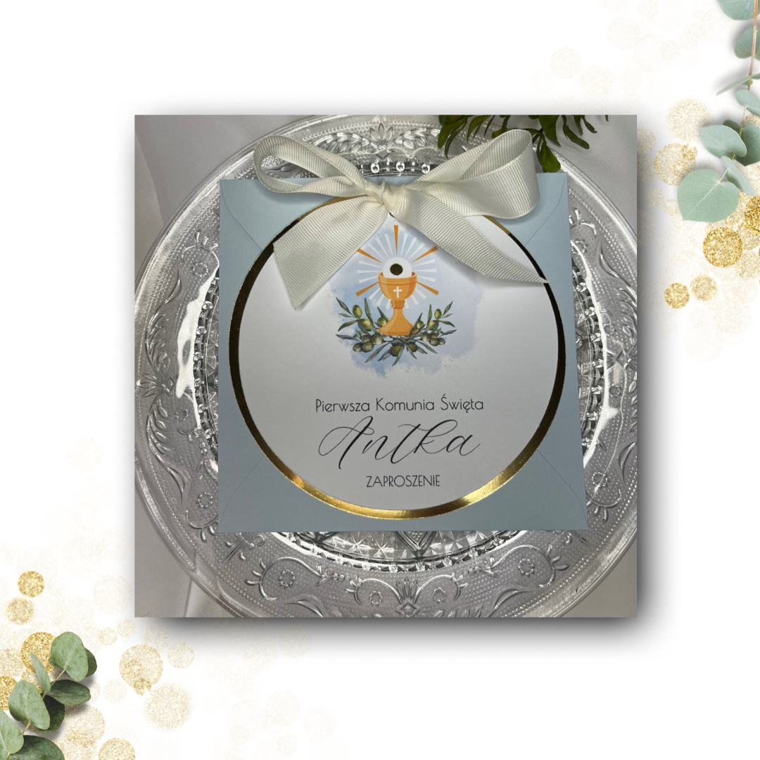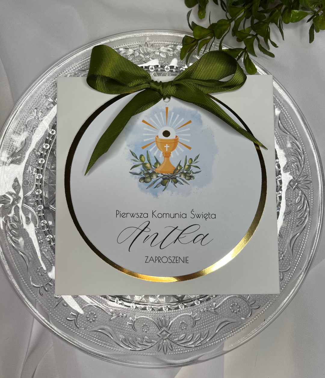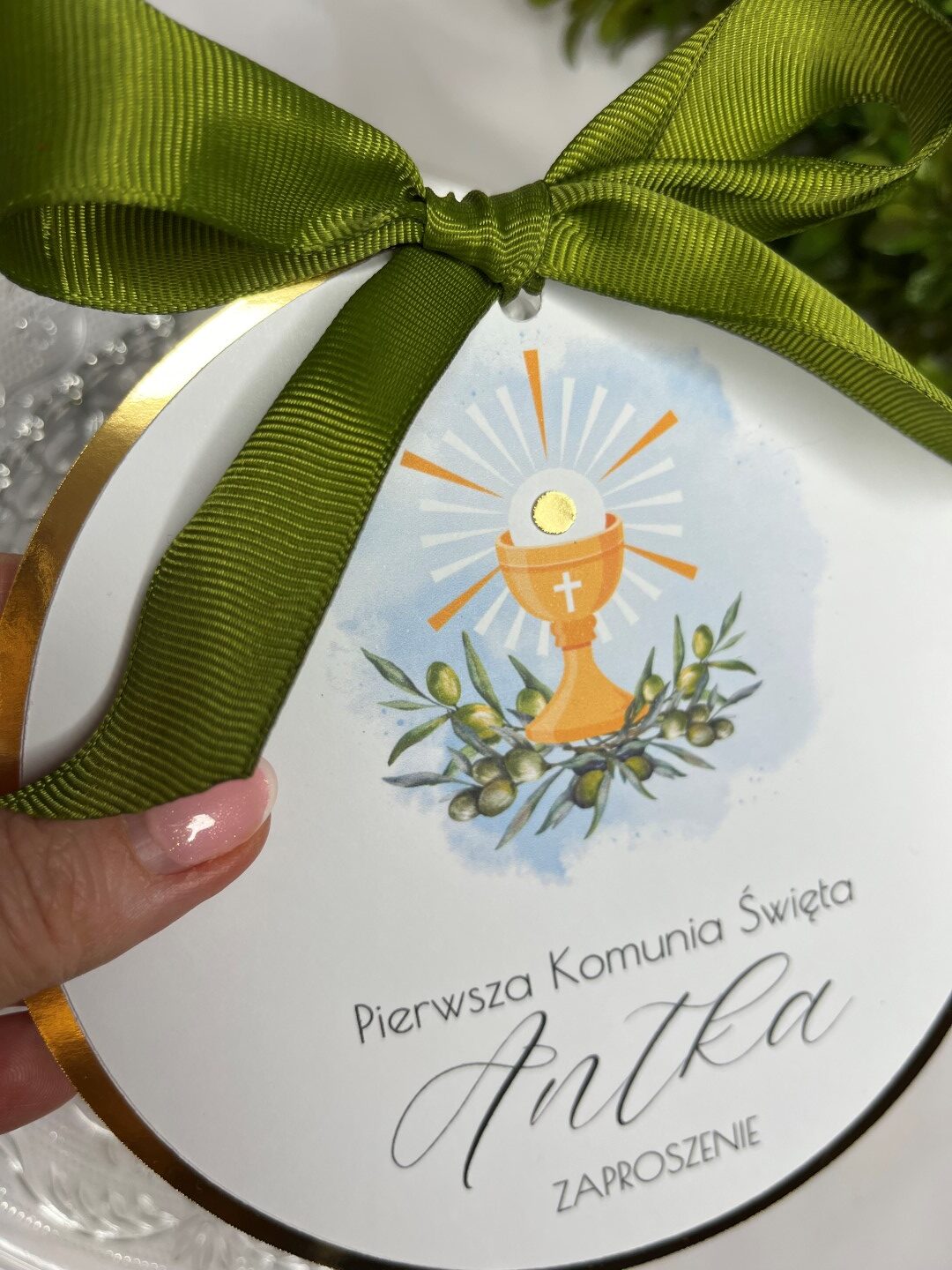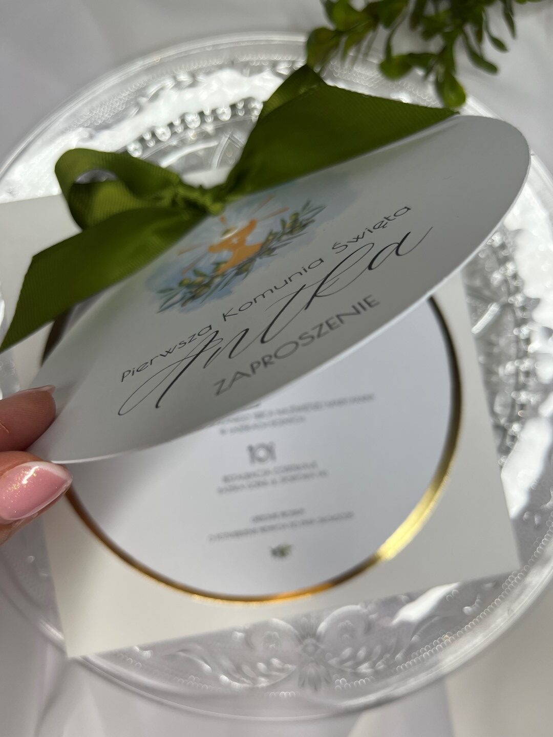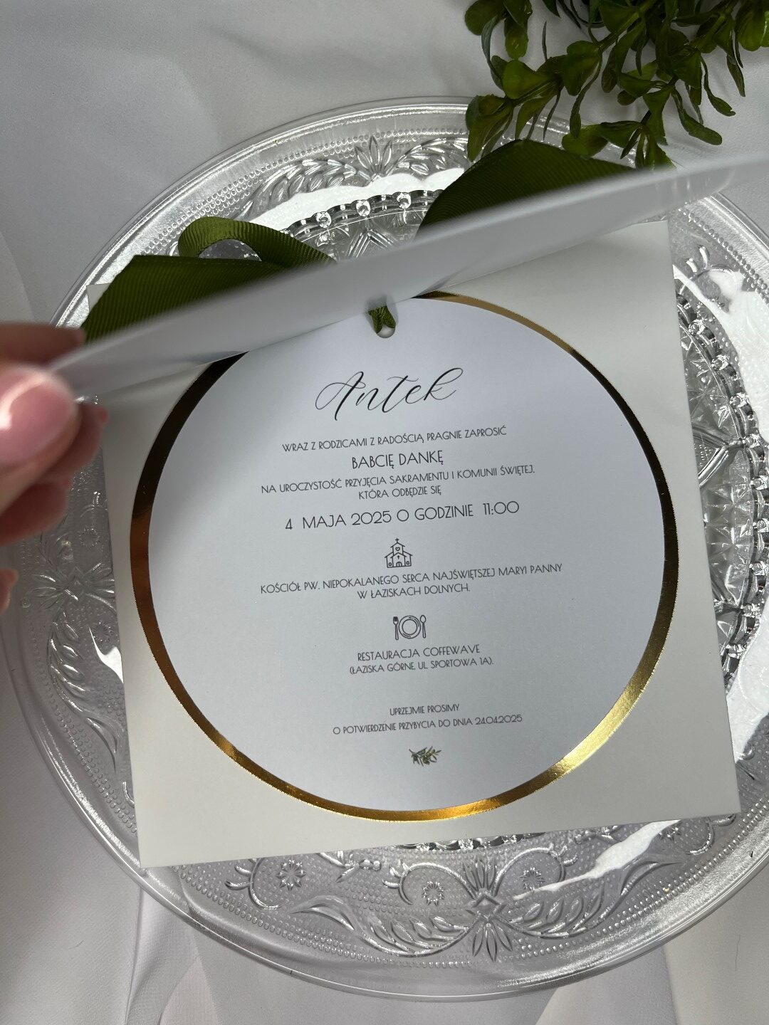 Wymiary zaproszenia: 14 cm średnica koło złote, 12,5 cm średnica przodu oraz środka zaproszenia