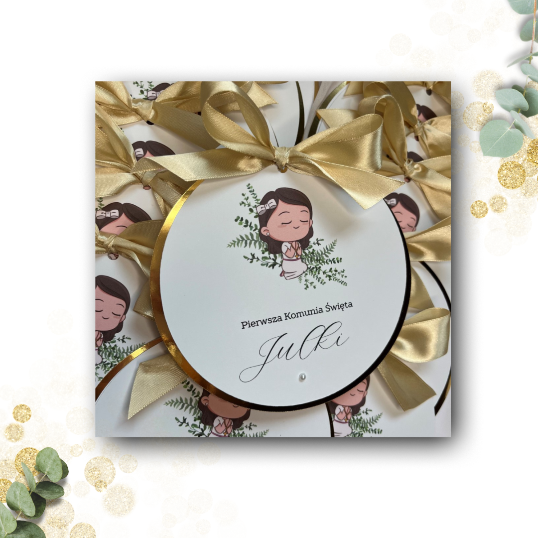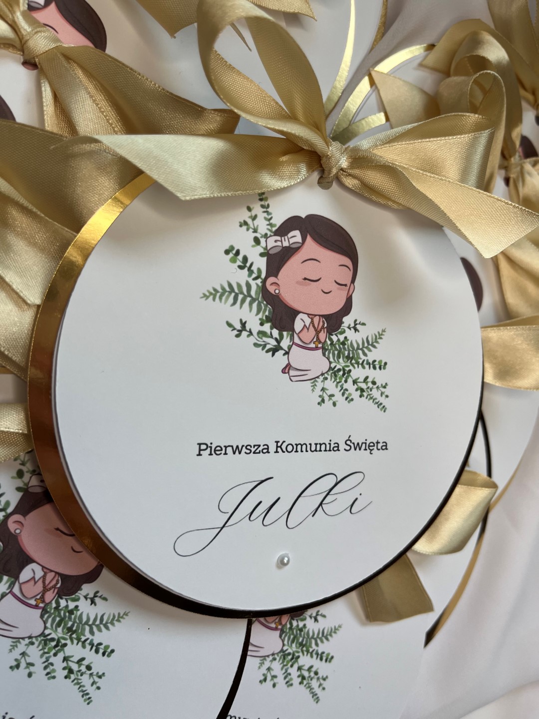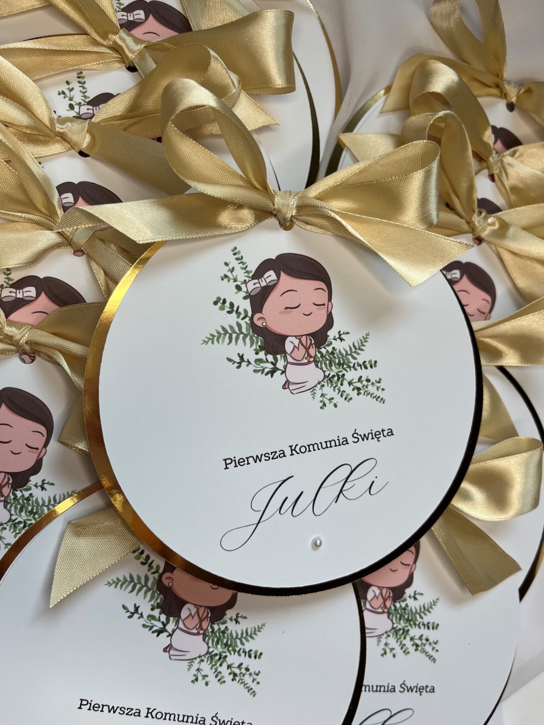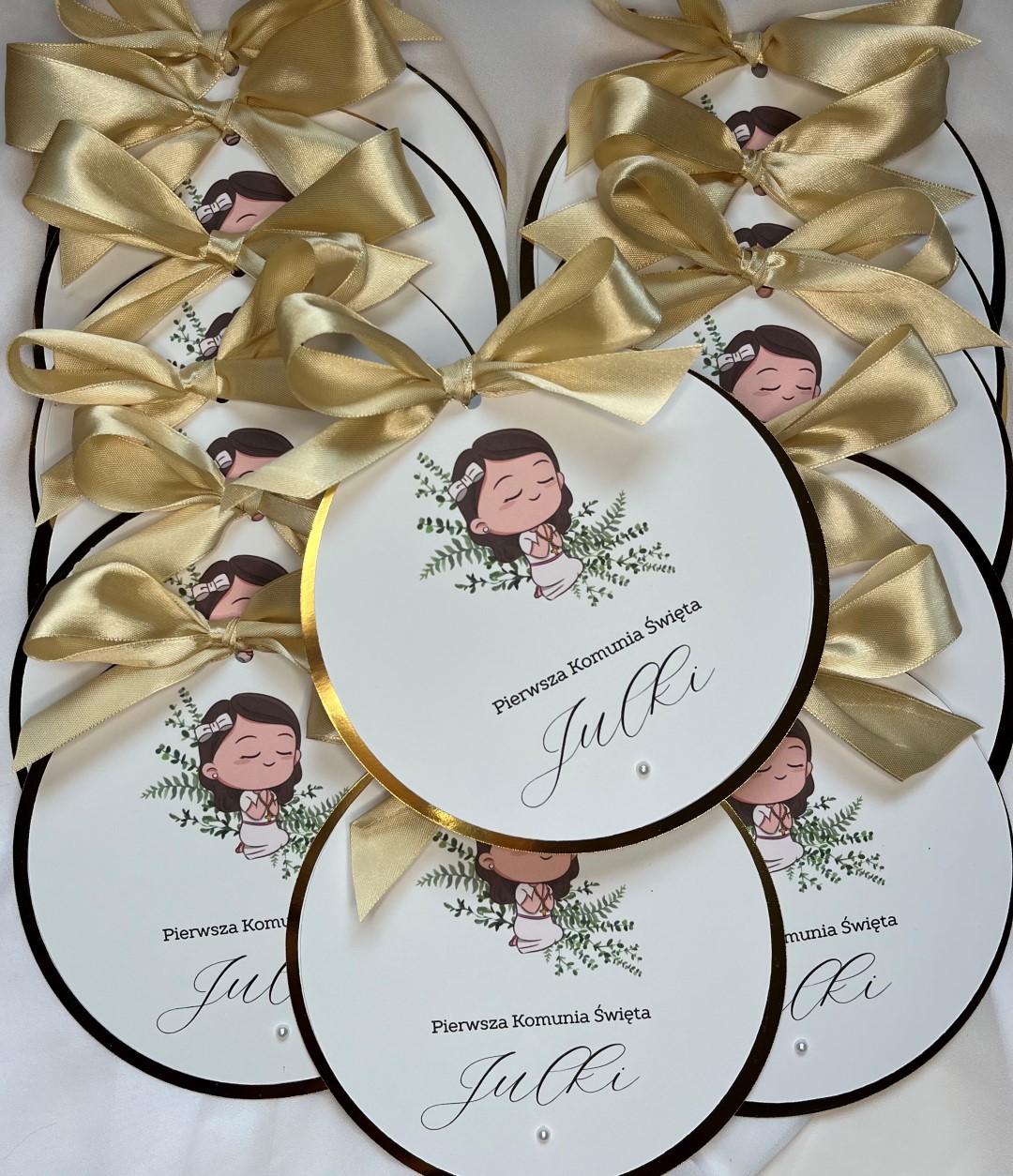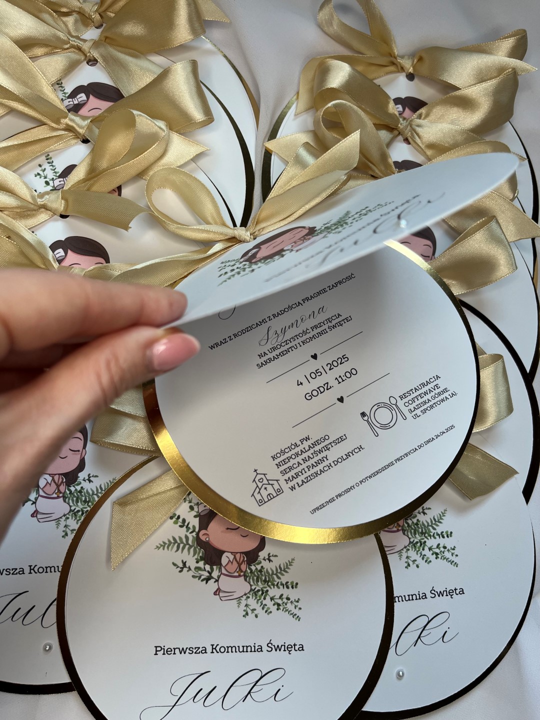 Wymiary zaproszenia: 14 cm średnica koło złote, 12,5 cm średnica przodu oraz środka zaproszenia