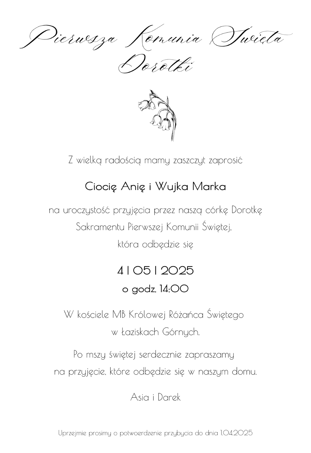 *Przedstawione zaproszenie jest jedynie projektem, który możesz dowolnie modyfikować, zmieniając zarówno czcionki, jak i układ tekstu.