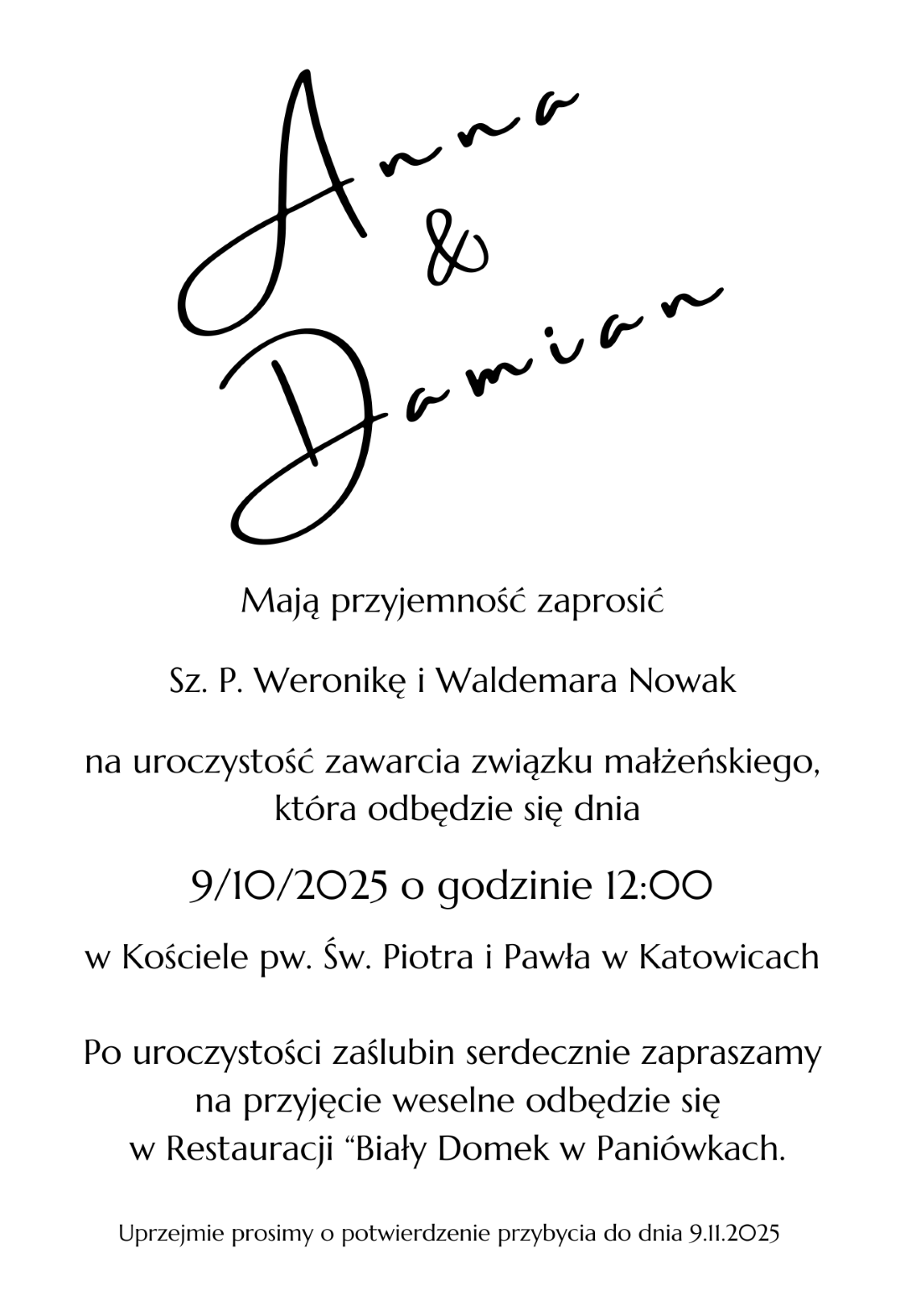 *Przedstawione zaproszenie jest jedynie projektem, który możesz dowolnie modyfikować, zmieniając zarówno czcionki, jak i układ tekstu.