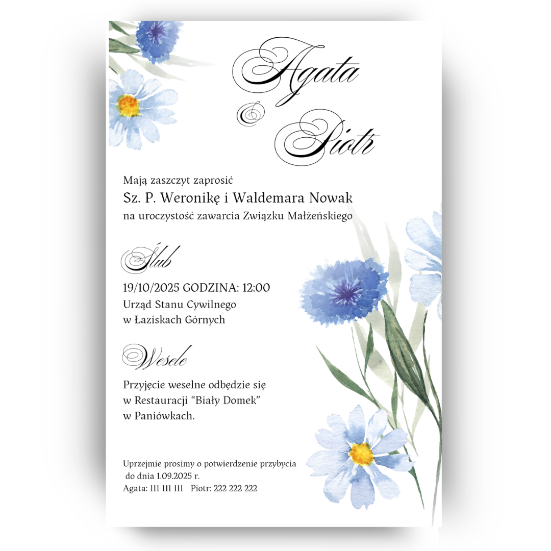 Zaproszenie ślubne jednokartkowe. Błękitna łąka.