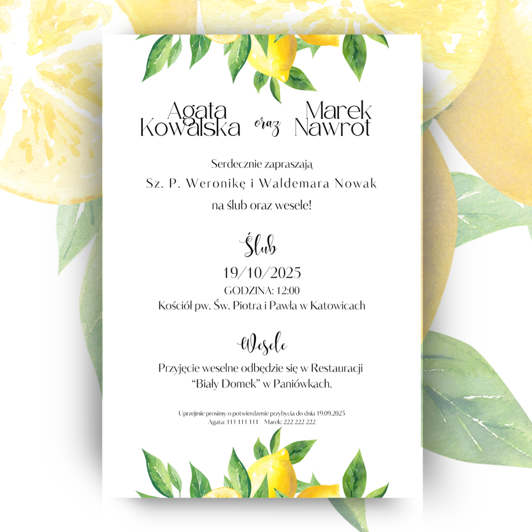 Zaproszenie ślubne jednokartkowe. Letnia Cytryna.