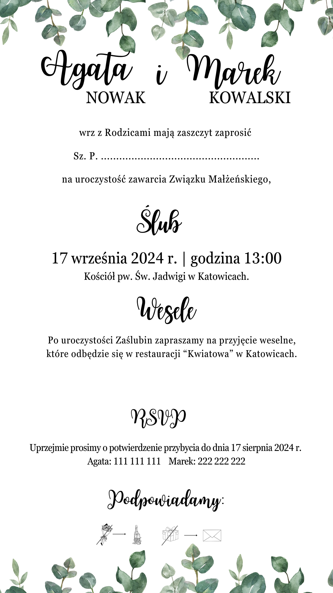 *Przedstawione zaproszenie jest jedynie projektem, który możesz dowolnie modyfikować, zmieniając zarówno czcionki, jak i układ tekstu.