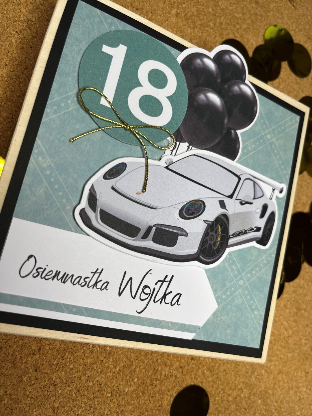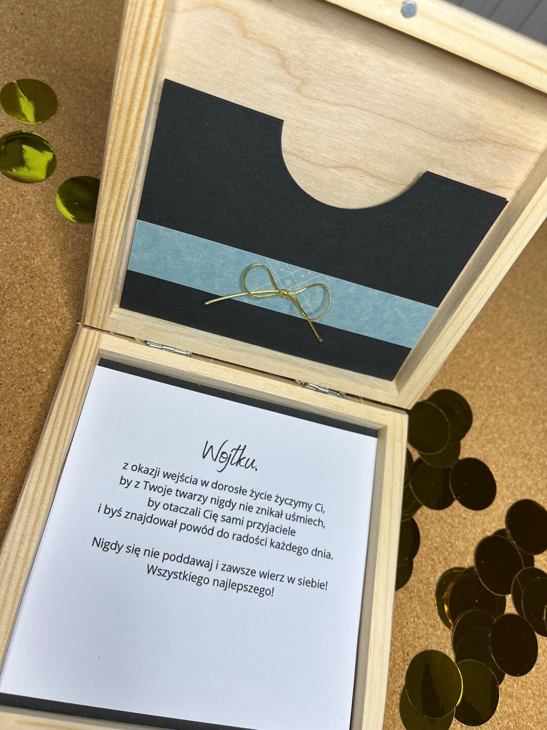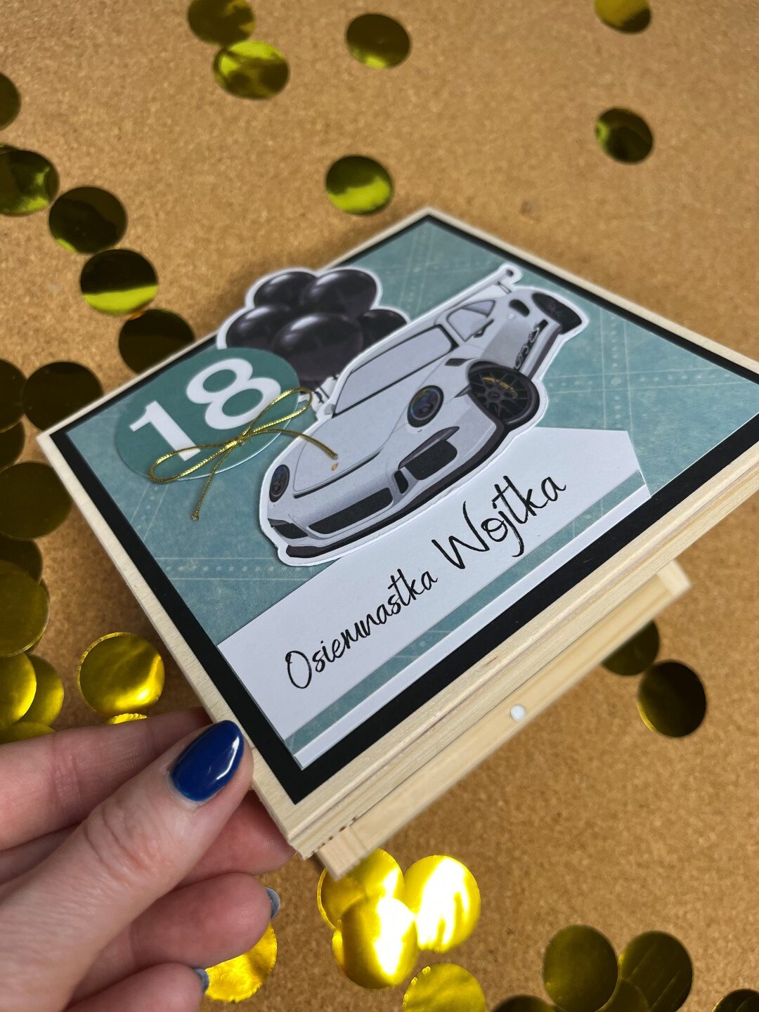 Personalizowana kartka- drewniane pudełko, z okazji osiemnastych urodzin to doskonały upominek będący jednocześnie kartką oraz pudełkiem na pieniądze.