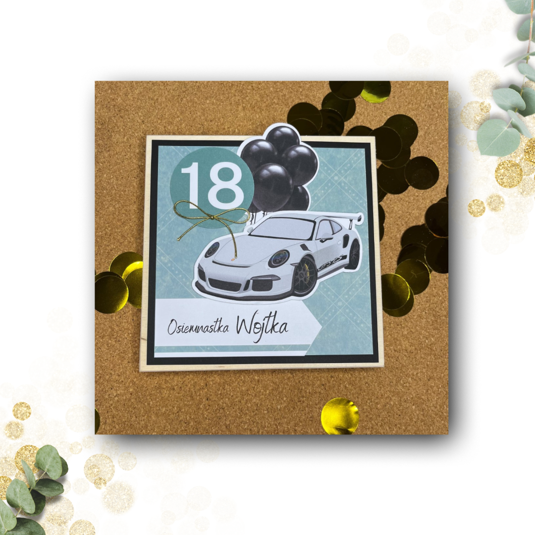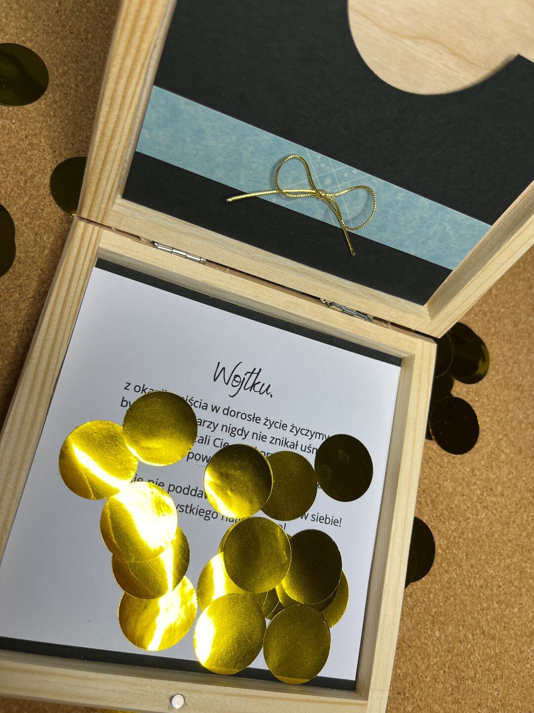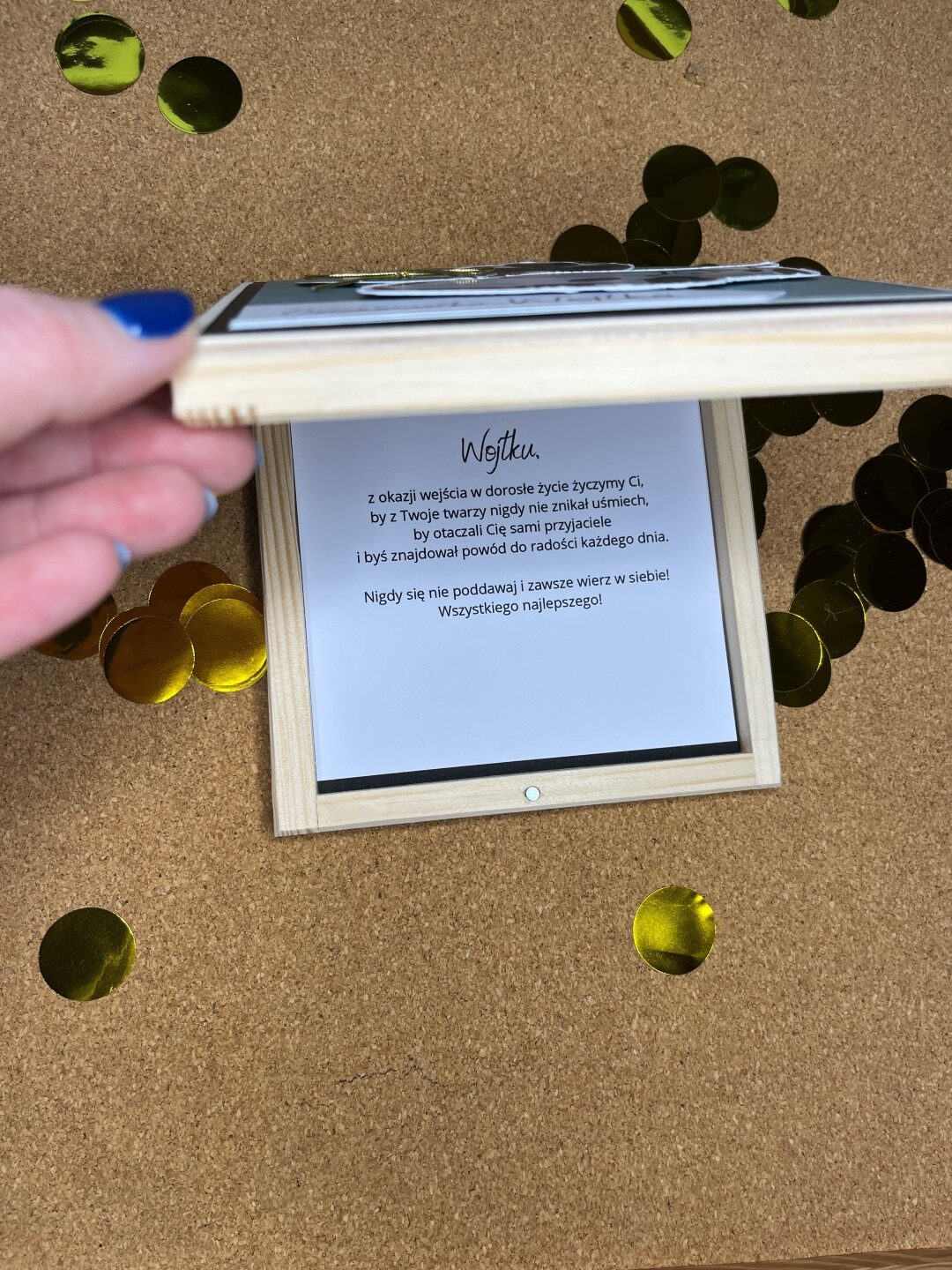 Personalizowana kartka- drewniane pudełko, z okazji osiemnastych urodzin to doskonały upominek będący jednocześnie kartką oraz pudełkiem na pieniądze.