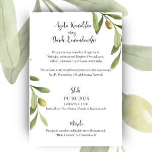 Zaproszenie ślubne jednokartkowe. Oliwka.
