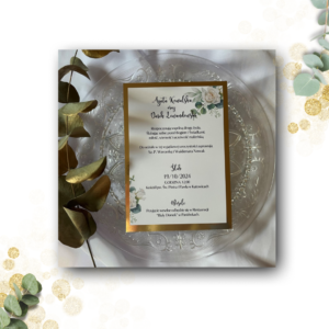 Złote zaproszenie ślubne z motywem białych kwiatów